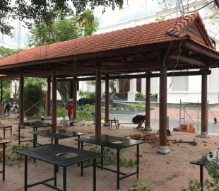 Công trình hai tầng sử dụng bộ khung nhà rường cũ rộng 72 m2 gồm 3 gian, bổ sung thêm hàng hiên phía trước, riêng gỗ vụn làm trần và vách.